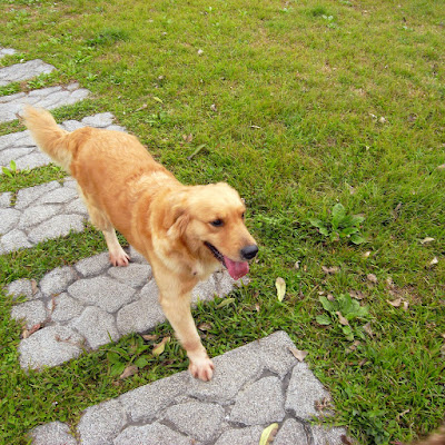 果然正妹不是叫假的,別家的狗狗都會不顧形象的跑過來跟她玩,可是她很呆又很膽小︿︿” ,都乖乖的跟著乾媽走,偶爾跟在她後面我們故意停下腳步她還會小心翼翼的回頭看乾媽還在不在,那個表情真的有夠逗趣的啦^^,經過我一天的觀察發現她是一隻淑女的黃金獵犬,哈哈~只是會偷大便。=”=
